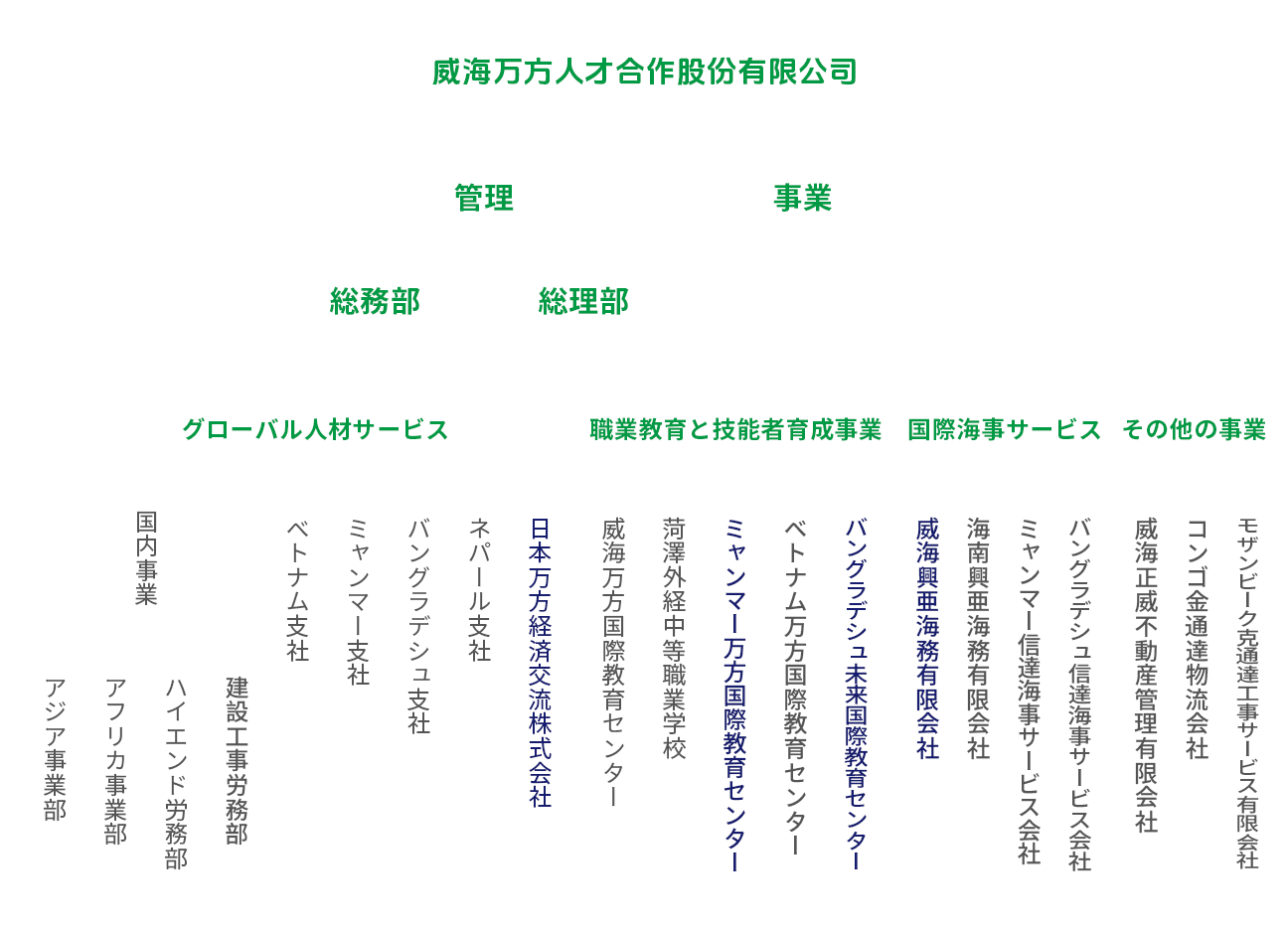當(dāng)社の事業(yè)內(nèi)容は、國內(nèi)外の人材派遣サービス(海外労働者送出事業(yè)を含む)、職業(yè)教育訓(xùn)練、國際海事サービス、不動産管理サービス、國際貿(mào)易、資本運営等、多岐にわたる分野に及んでいます。當(dāng)社は2017年に持株制度への仕組み変更を?qū)g施し、2018年6月に全國中小企業(yè)株式譲渡システムに上場し、正式に資本市場に進出しました(証券コード:872813)。